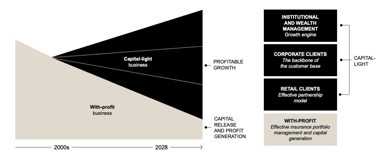 Mandatum’s long-term strategy is to grow in the capital-light business areas, i.e. in Wealth management, Corporate clients and Retail clients, while scaling down the capital-heavy with-profit business in a planned and predictable manner. This strategy has been in place since the early 2000s, when sales of new with-profit pension insurance policies were discontinued and the company started building growth in the capital-light business areas.